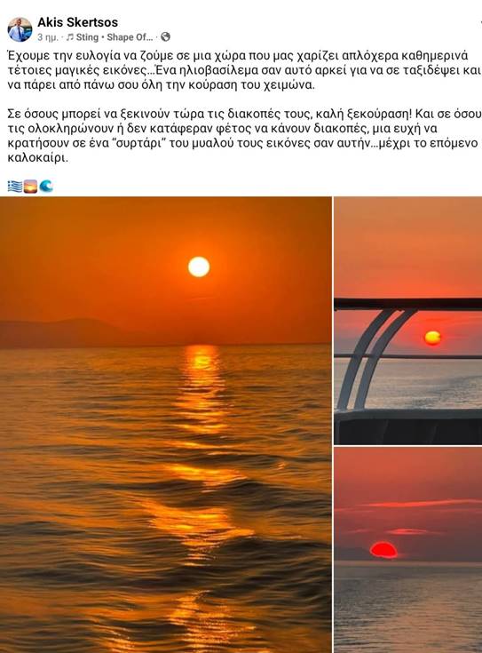 Απύθμενο θράσος του κ. Σκέρτσου! Στέλνει ηλιοβασιλέματα στους πολίτες που δεν μπόρεσαν να πάνε διακοπές για να τα κρατήσουν σε ένα «συρτάρι» του μυαλού. Τι ντροπή!