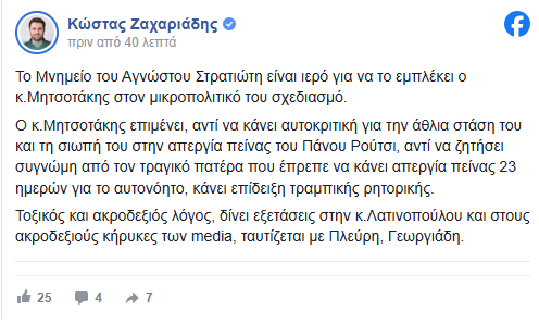 Ο κ. Μητσοτάκης επιμένει, αντί να κάνει αυτοκριτική για την άθλια στάση του και τη σιωπή του στην απεργία πείνας του Πάνου Ρούτσι, αντί να ζητήσει συγνώμη από τον τραγικό πατέρα που έπρεπε να κάνει απεργία πείνας 23 ημερών για το αυτονόητο, κάνει επίδειξη τραμπικής ρητορικής.
