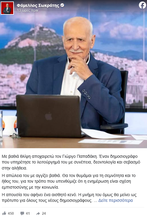 Με βαθιά θλίψη αποχαιρετώ τον Γιώργο Παπαδάκη. Έναν δημοσιογράφο που υπηρέτησε το λειτούργημά του με συνέπεια, δεοντολογία και σεβασμό στην αλήθεια.