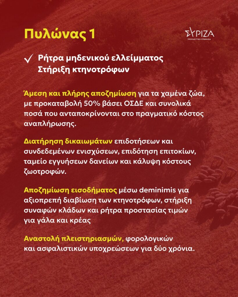 - Άμεση και πλήρης αποζημίωση για τα χαμένα ζώα, με προκαταβολή 50% βάσει ΟΣΔΕ και συνολικά ποσά που ανταποκρίνονται στο πραγματικό κόστος αναπλήρωσης.