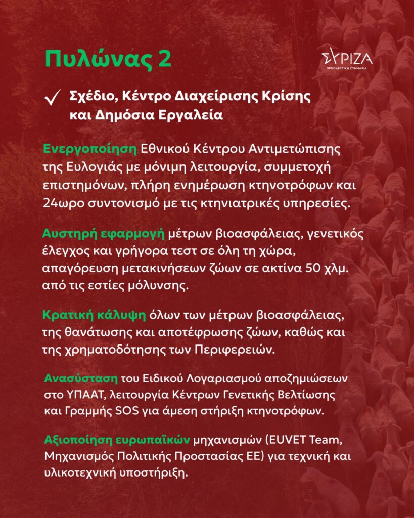 Απέναντι σε αυτή την καταστροφική πραγματικότητα, και την εγκληματική ανικανότητα της Κυβέρνησης, ο ΣΥΡΙΖΑ – ΠΣ παρουσιάζει ένα ολοκληρωμένο, επιστημονικά τεκμηριωμένο και εφαρμόσιμο σχέδιο, που στηρίζεται στη γνώση και την ευθύνη, με στόχο την άμεση αντιμετώπιση της κρίσης και την προστασία της ελληνικής κτηνοτροφίας.