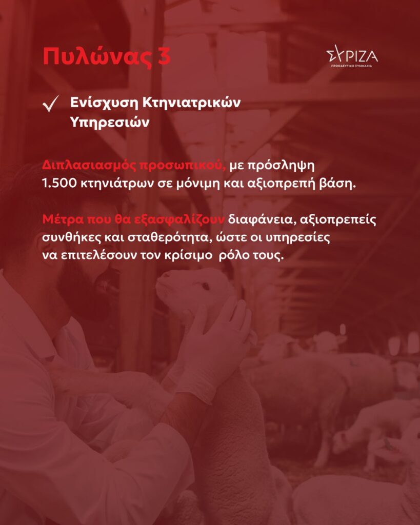 - Διπλασιασμός προσωπικού, με πρόσληψη 1.500 κτηνιάτρων σε μόνιμη και αξιοπρεπή βάση.