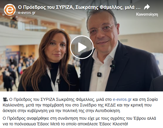 Αναλυτικά τα όσα ανέφερε ο Σωκράτης Φάμελλος στο e-evros.gr και τη Σοφία Καλλονιάτη για τον πρωτογενή τομέα και τη συνάντησή του με τους αγρότες και κτηνοτρόφους: